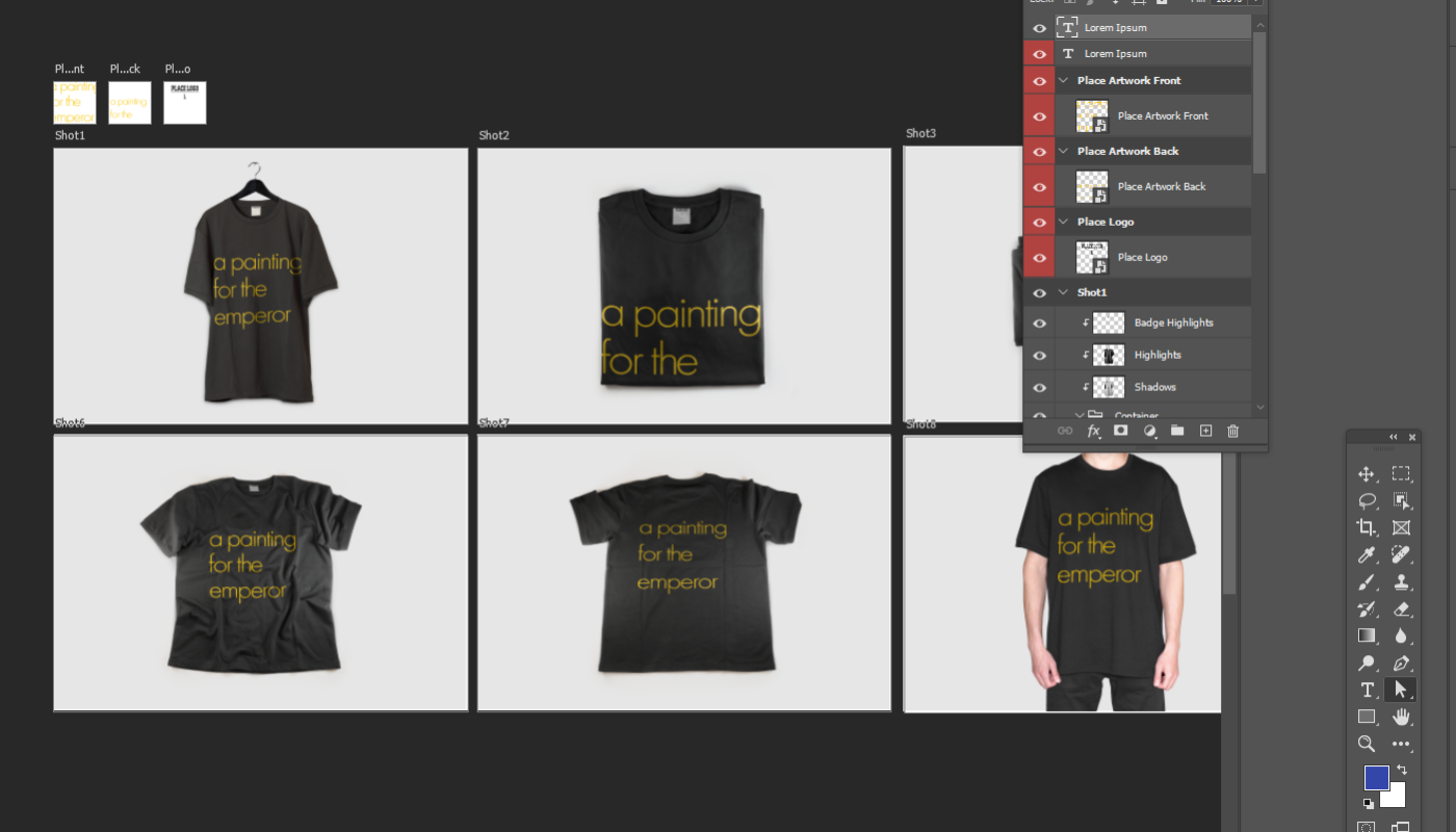 Next we’ll apply the logo to a t-shirt mock-up template, which I purchased online. You can purchase this particular one here, It’s not very expensive and will automatically map the graphic asset into the correct place and comes complete with three different t-shirt colours. The t-shirt mock-up package allows you to attach the custom graphic directly from a linked PSD. Hey presto, it automatically generates all the marketing shots you need to present your t-shirt in the best possible light.