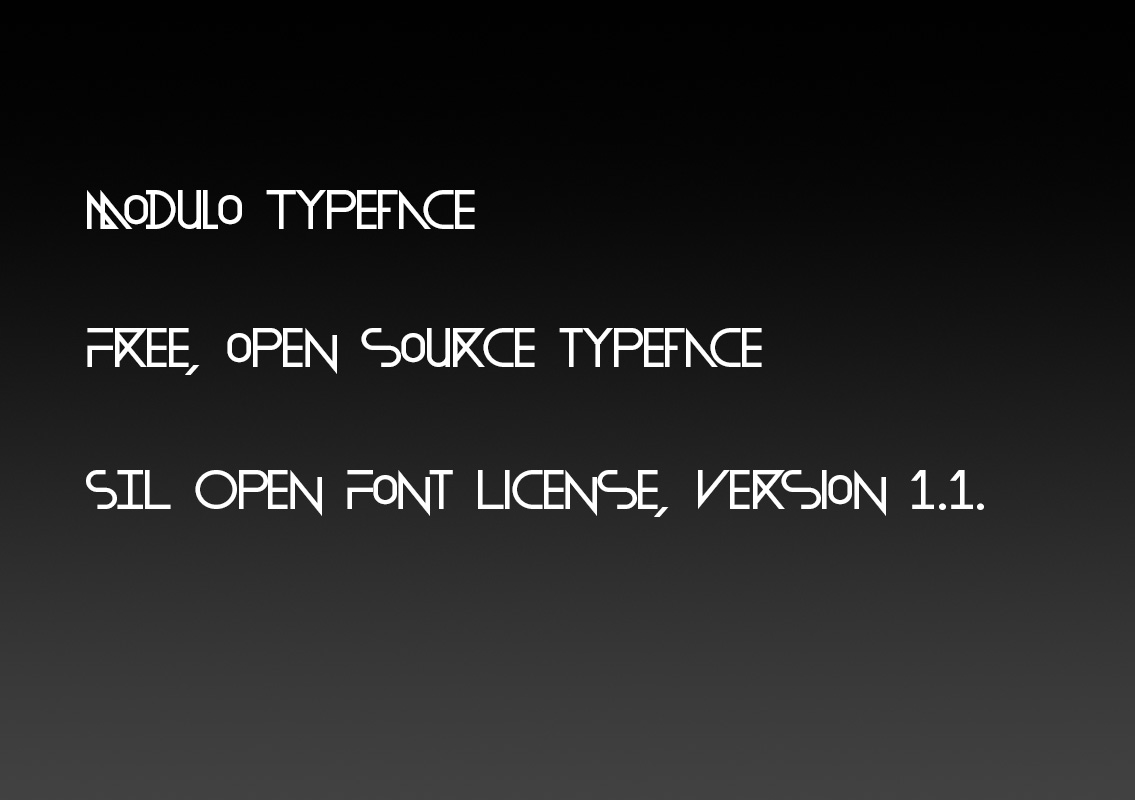 A free open source sans serif font, the modulo font is a decorative display font. This particular font would be suitable for use on headlines, titles, posters, flyers and stylised digital works. The font is free to use under the OFL Open Font License which allows the user to use, copy, merge, embed and modify copies of the typeface (subject to the terms of the OFL). The font was created by UnderNoControlTypofoundry and can be downloaded here.
