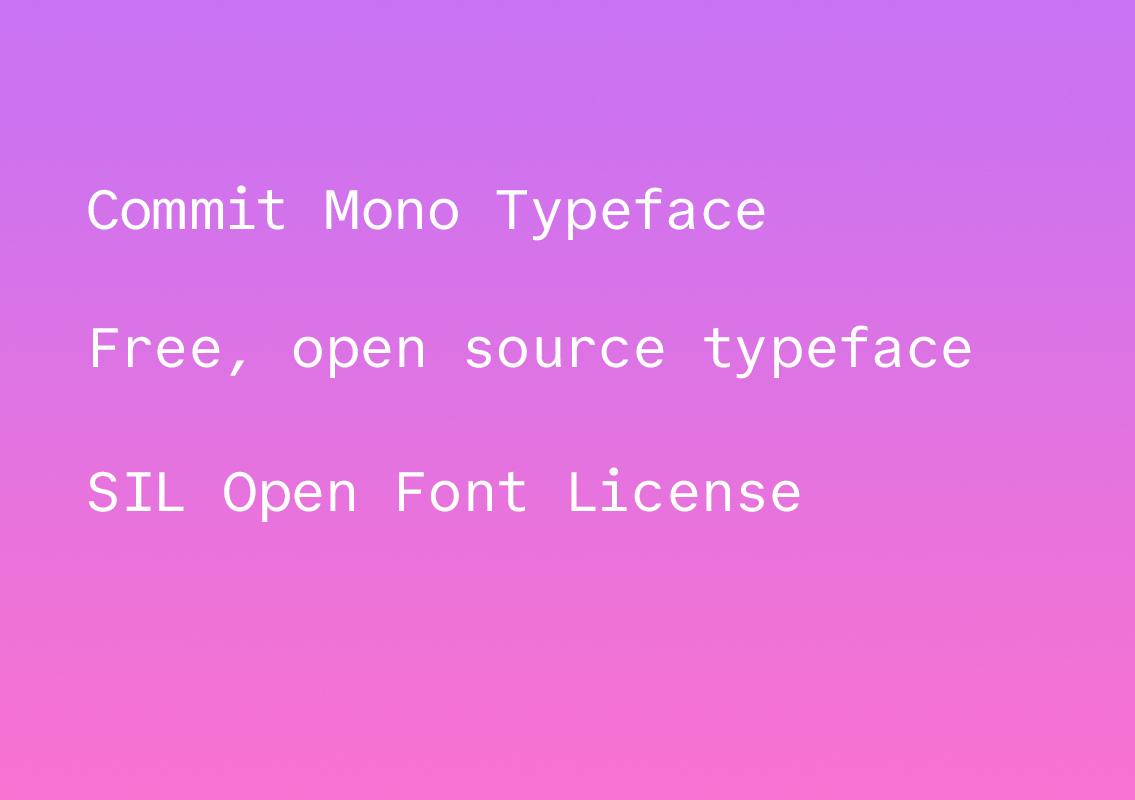 A free open source minimalist, coding and programming font, the Commit Mono which has a clean and easy to read style, would be suitable for use on headlines, titles, technical text and documents. The font is free to use under the OFL Open Font License which allows the user to use, copy, merge, embed and modify copies of the typeface (subject to the terms of the OFL). The font was created by skrift studio and can be downloaded here.