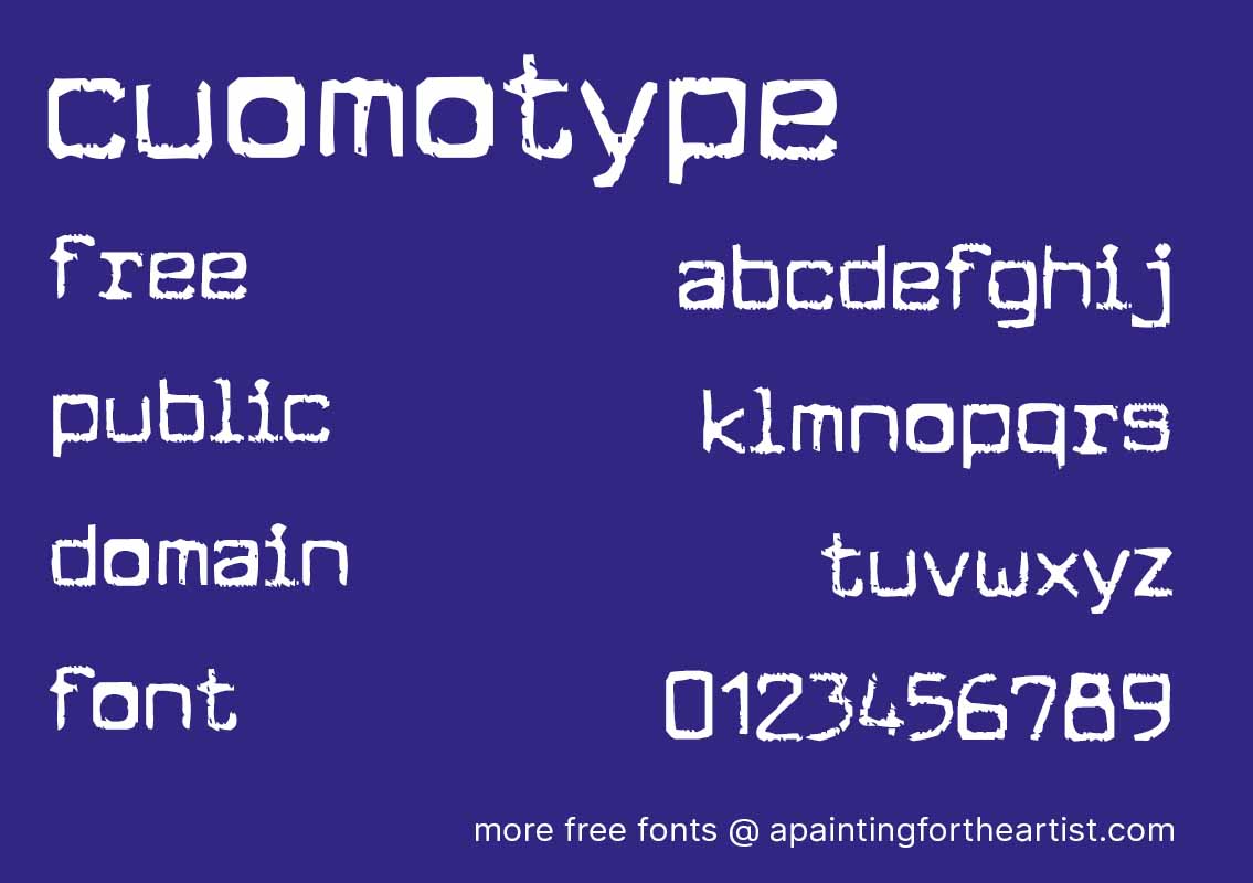 A free public domain licensed decorative font, Cuomotype, designed by Typodermic Fonts of Japan between 1996 and 2001. The font would be suitable for use on headlines, titles, displays, flyers & posters, creative and artistic works. The font is free to use for most use cases, (see the license for exact details) including; commercial, non-commercial and personal works under the CC0 Public Domain license, and can be downloaded here.