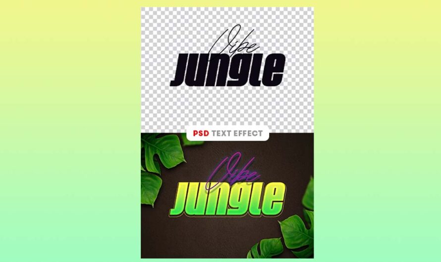 This photoshop PSD template is a high resolution free jungle, bold, 80s, 1980s, vibrant, modern, italics, neon title text effect PSD. The photoshop PSD mock-up …